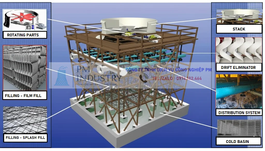 Một tháp giải nhiệt điển hình bao gồm các thành phần cơ bản sau: