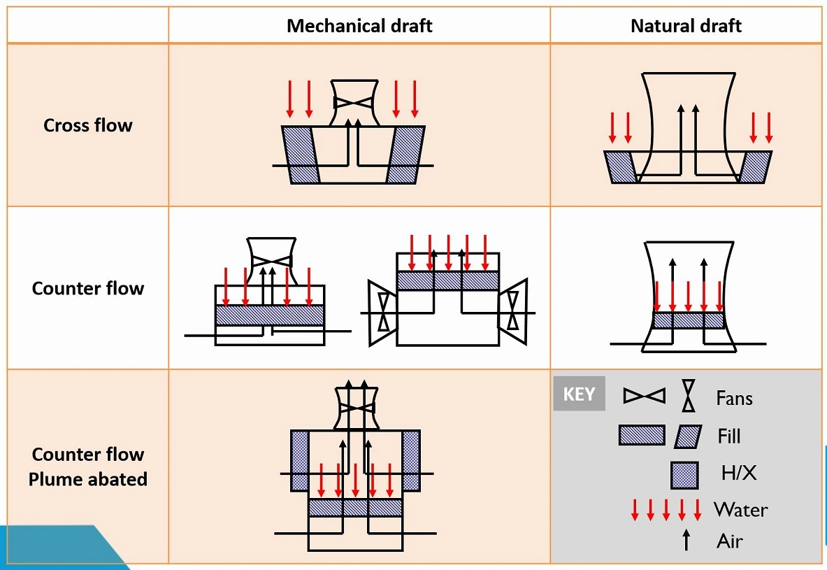 Tháp giải nhiệt được phân loại dựa trên phương thức tạo ra dòng không khí và cách tiếp xúc giữa nước và không khí: